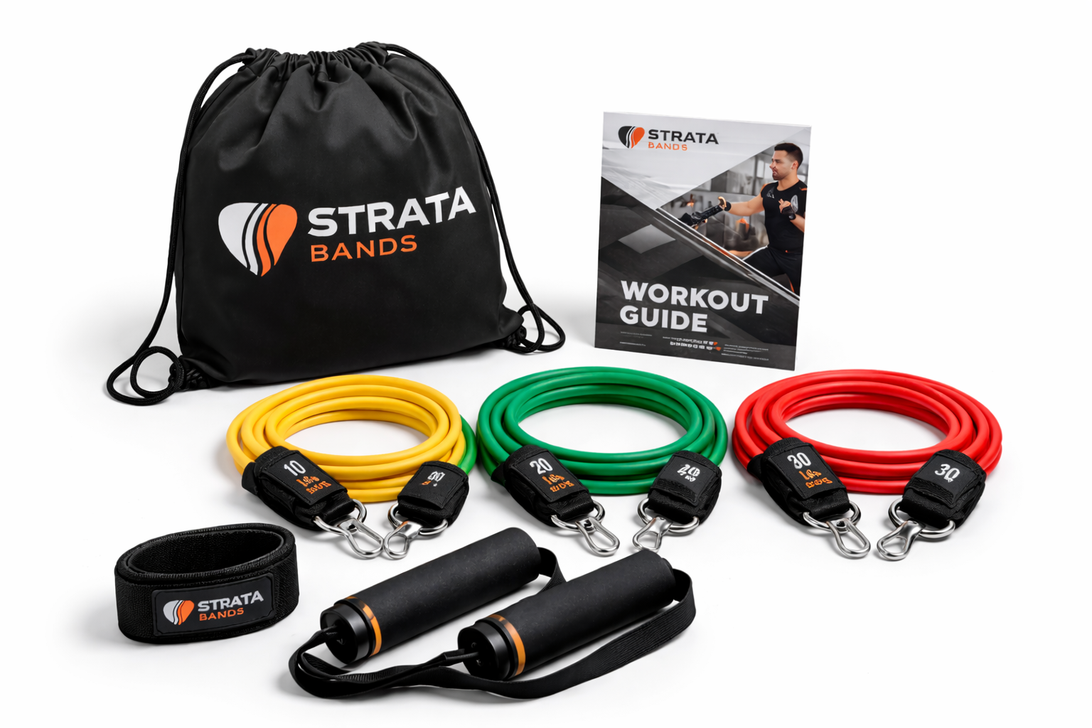 The Strata Starter Resistance Band Set includes multiple resistance levels, handles, a door anchor, ankle straps, and a carry bag. Ideal for beginners who want simple, effective strength training anywhere.